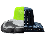 The 2 Stage DOT Filter is designed for greater sediment retention while still providing for stormwater overflow. The base of the filters is made of durable pouches for placement of rock or stone weight. Stage 1 of this filter impounds approximately 16 inches of water and is made of gray, nonwoven fabric providing >96% efficiency of sediment filtration. Stage 2 is made of high visibility, high flow green mesh providing >1100gpm/ft2 stormwater overflow.