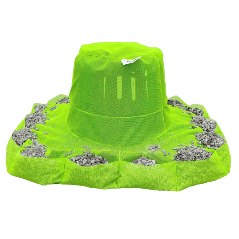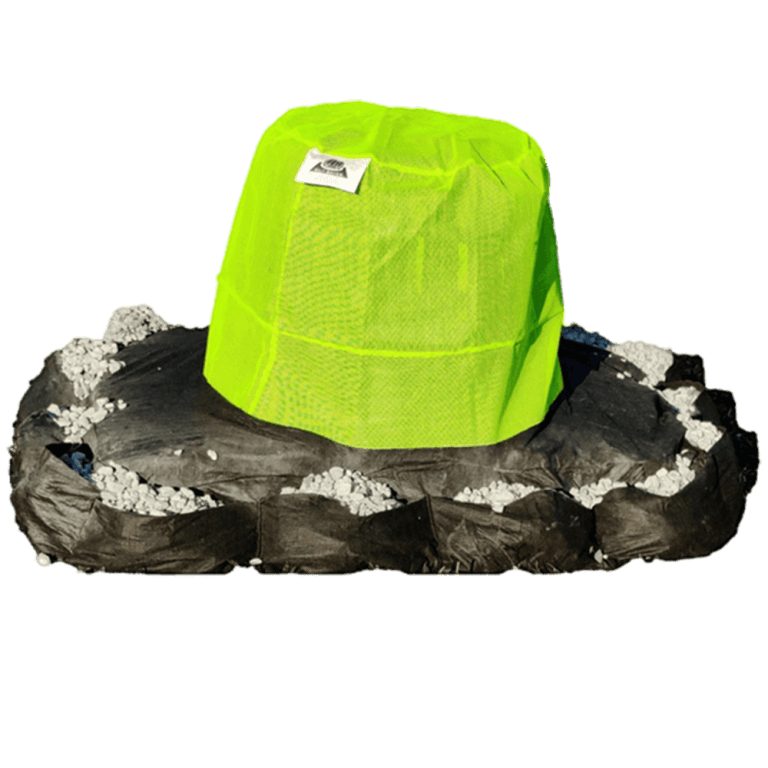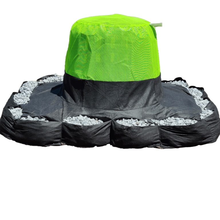 The High Flow Filter is designed to prevent flooding in areas of high water flow. The base of the filters is made of durable pouches for placement of rock or stone weight. The rock bags impound approximately 8 inches of stormwater. The remainder of this filter is made of high visibility high flow green mesh that allows significant water to flow through while still preventing trash and floatables from entering the pipe system.