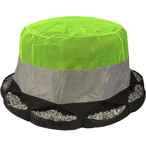 The 2 Stage DOT Filter is designed for greater sediment retention while still providing for stormwater overflow. The base of the filters is made of durable pouches for placement of rock or stone weight. Stage 1 of this filter impounds approximately 16 inches of water and is made of gray, nonwoven fabric providing >96% efficiency of sediment filtration. Stage 2 is made of high visibility, high flow green mesh providing >1100gpm/ft2 stormwater overflow.