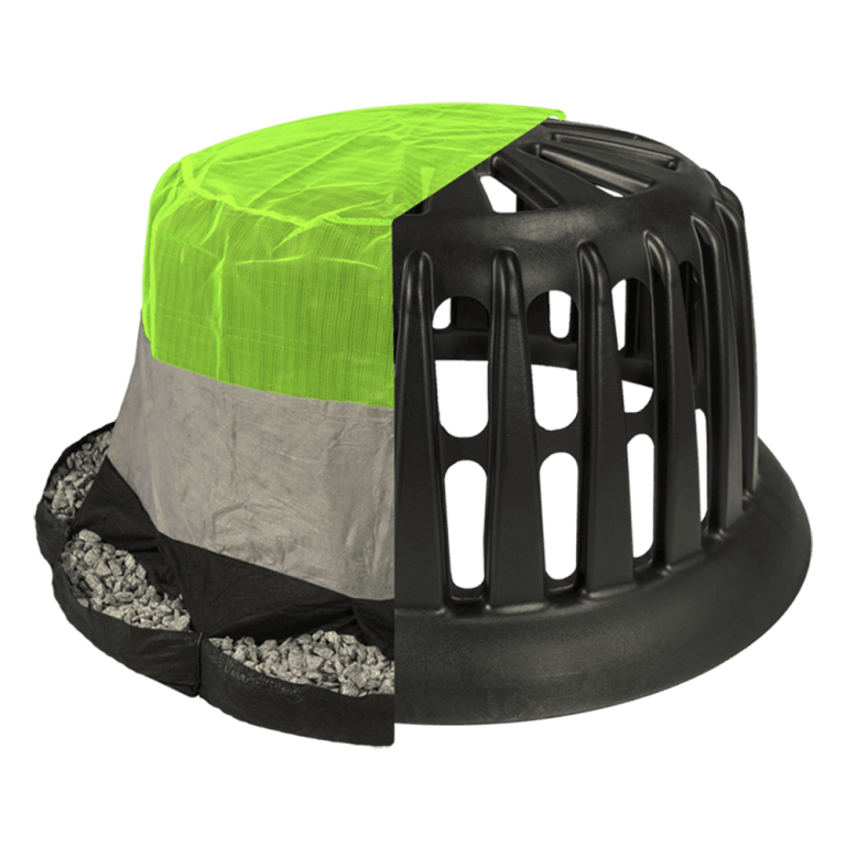 The High Flow Filter is designed to prevent flooding in areas of high water flow. The base of the filters is made of durable pouches for placement of rock or stone weight. The rock bags impound approximately 8 inches of stormwater. The remainder of this filter is made of high visibility high flow green mesh that allows significant water to flow through while still preventing trash and floatables from entering the pipe system.