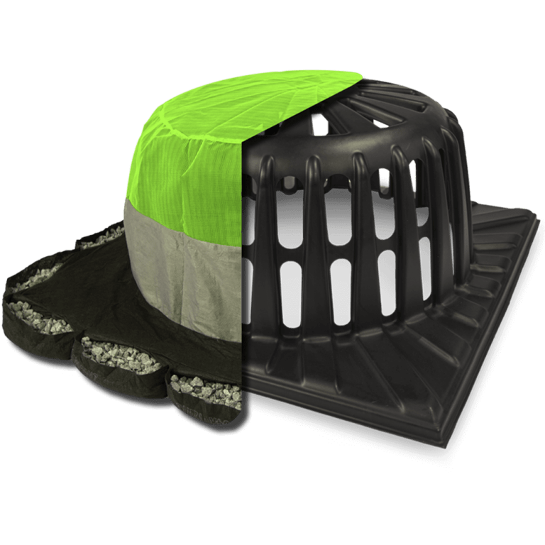 The High Flow Filter is designed to prevent flooding in areas of high water flow. The base of the filters is made of durable pouches for placement of rock or stone weight. The rock bags impound approximately 8 inches of stormwater. The remainder of this filter is made of high visibility high flow green mesh that allows significant water to flow through while still preventing trash and floatables from entering the pipe system.